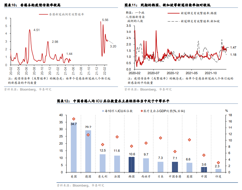 2)结合每平方公里人口密度和人均住房面积来看,香港居民的居住环境“密度”较大,增加了疫情传播风险;数据显示香港本轮疫情传染率明显高于同期的韩国、美国、英国。香港的人口密度达到6800人/平方公里,而我国前十大城市中人口密度最高的为深圳市(8830人/平方公里),排名第二的上海仅有3925人/平方公里、北京只有1330人/平方公里;香港人均住房面积更明显低于以“密度大”闻名的韩国首尔,据Our HongKong Foundation数据,香港的人均住房面积为18.9 平方米;而首尔的人均住房面积为30.1 平方米,新加坡为27.6平方米