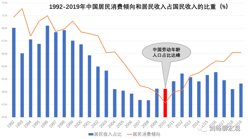 那么,在居民收入占比过低和消费倾向过低两个因素中,哪一个对消费的影响更大呢?是前者。因为消费倾向依赖于收入,收入高,收入稳定,消费倾向自然也就高。而且,观察新冠疫情前的数据可以发现,自2010年中国劳动年龄人口占比达峰以后,居民消费倾向就在不断上升,相应的,居民储蓄倾向(储蓄/可支配收入)不断下降。