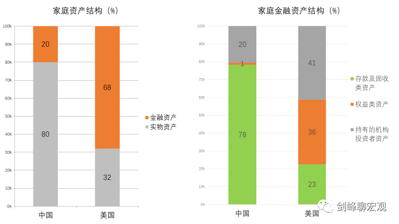 在资产一定的情况下,增加财产收入的方法之二是改善居民的财产结构。观察中美居民的财产结构可以发现中国居民财产收入低的第二个症结,即实物资产占比过高,在金融资产中存款类资产占比过高,这两项均是低收益的资产。相反,美国居民的金融资产占比很高,金融资产中权益类资产和持有的机构投资者资产(养老基金、共同基金、寿险等)占比很高。算起来,在美国居民部门金融资产中,直接和通过机构投资者间接持有的权益类资产达到50%以上——这是居民财产收入较高的另外一个原因。