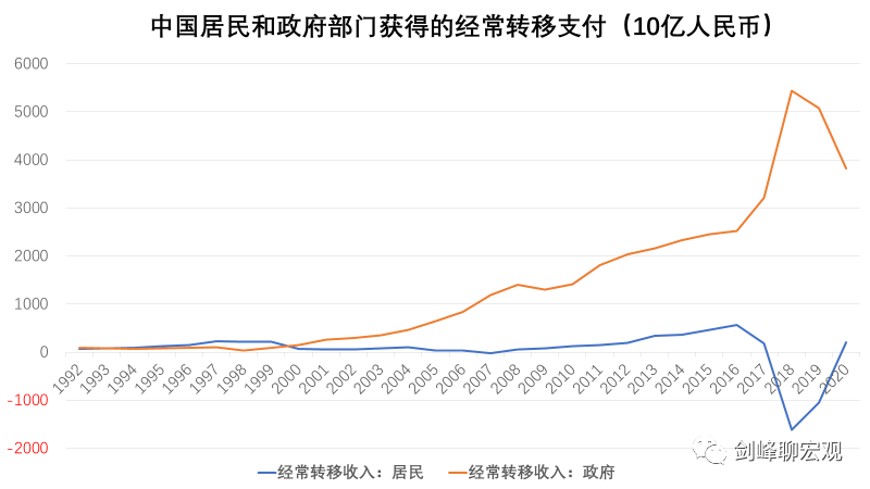 除了财产收入之外,提高居民收入占国民收入的比重,更加直接和迫切的途径是增加居民的经常转移收入。财政的职能之一就是再分配,即利用收缴的税收和非税收收入,反补给居民部门中的弱势群体。然而,观察中国经常转移的部门分布,政府部门得到的经常转移收入常年以来都远远高于居民部门。在2018和2019年,居民部门的经常转移收入甚至是负值。在新冠疫情爆发的2020年,虽然政府的经常转移收入有所下降,但仍然高达3.8万亿,居民的经常转移收入有所上升,但也只有区区不过2千亿。