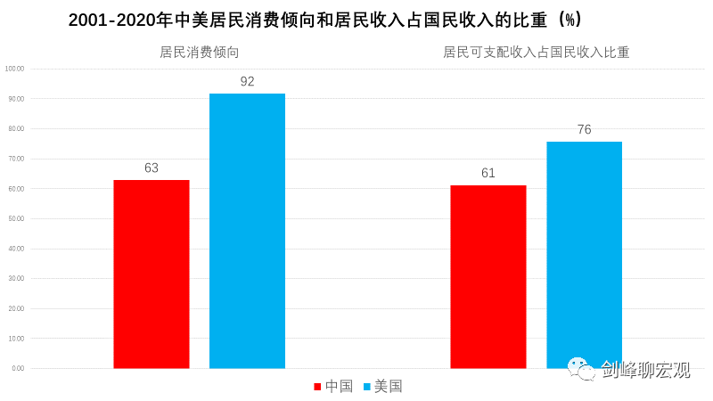 在主要国家中,中美两国的总需求结构正好相反,中国是投资高、消费低,美国是消费高、投资低。比较中美两国居民收入占比和居民消费倾向就可以发现问题所在。在2001到2020的二十年间,中国居民收入占比平均只有61%,而美国是76%;中国居民消费倾向是63%,而美国是92%。