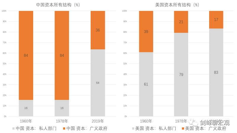 要增加居民的财产收入,首先是要让居民部门拥有财产。如果不拥有财产,怎么能够获得财产收入呢?作为加入生产函数、推动经济增长的生产要素,资本是整个经济中财产收入的最终来源,所以,资本的所有权属性决定了居民财产收入。根据国际货币基金组织的统计,1978年改革开放后,在中国资本所有结构中,私人资本大幅上升,但直至2019年私人资本占比也只有64%,国有资本(即广义政府拥有的资本)占比高达36%。相比之下,在美国的资本所有结构中,2019年私人资本占到83%的份额。