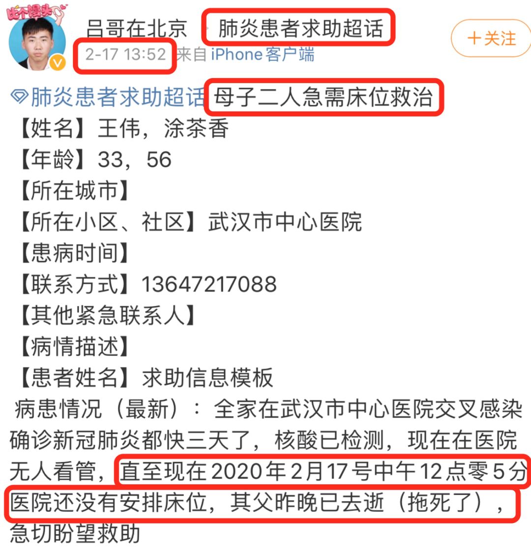 肺炎患者求助超话中,有一条也是今天发的。求助者全家感染。母子二人急需床位。