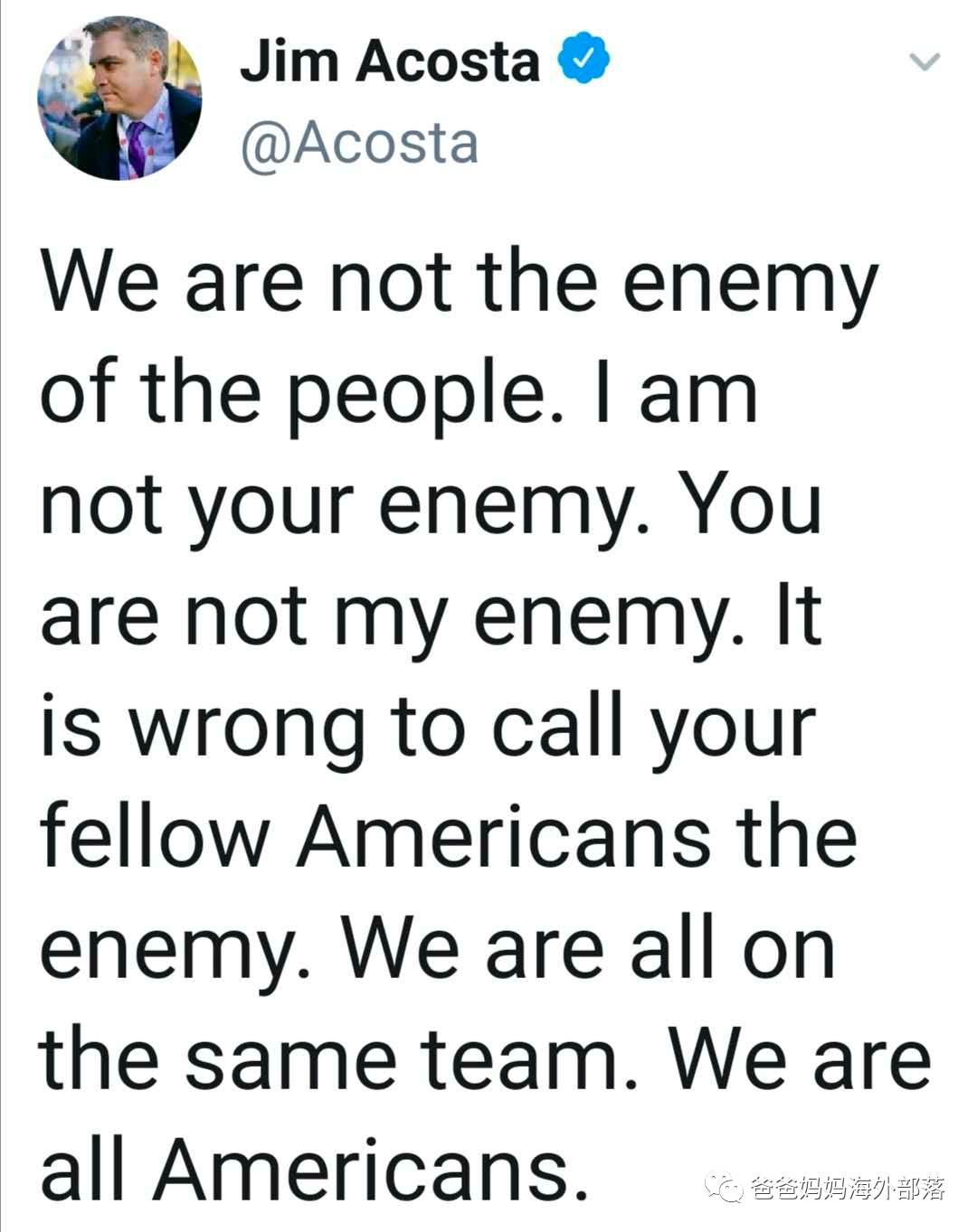 We are not the enemy of the people. I am not your enemy. You are not my enemy. It is wrong to call your fellow Americans the enemy. We are all on the same team. We are all Americans. 我们不是人民的敌人,你也不是我的敌人,称呼“人民公敌”是错误的,我们是同一条战壕的战友,我们都是美国人!