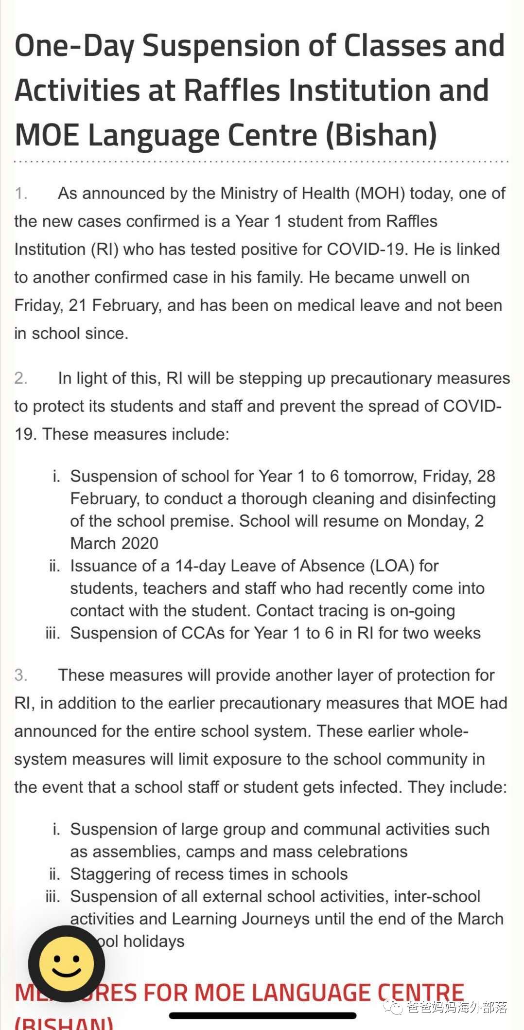 最近,新加坡的感染人群有一个中学的学生,因此,这个学校停课一天消毒,停课那天是周五, 周一就又上课了,课外活动取消14天。