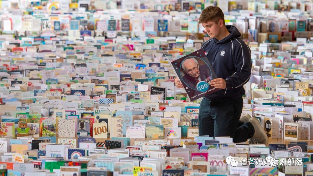 四月三十日是老人家百岁寿辰,这些天,来自世界各地的生日贺卡像雪片一样落在摩尔的手上,12.5万张生日卡片铺陈在他孙子学校的体育馆里,这其中有威廉王子夫妇、英格兰足球队长凯恩等名人的祝福。