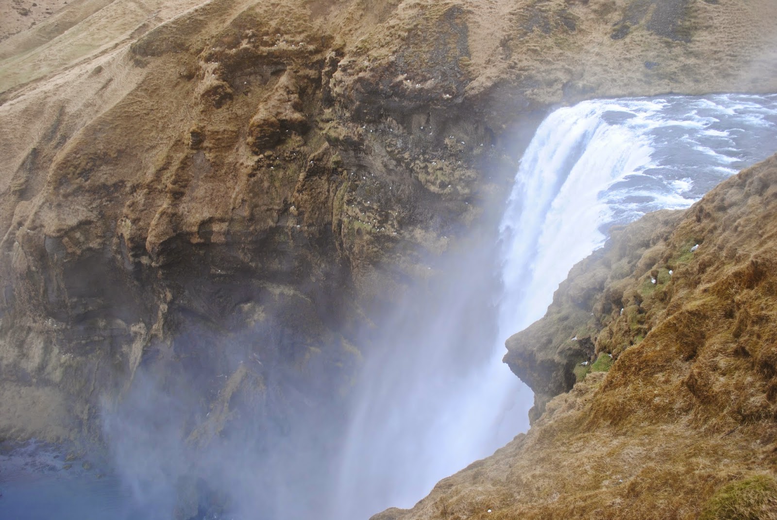 我们乘兴绕到瀑布后面,结果被瀑布的水气淋了个遍,还好穿着防水的冲锋衣,但裤子不是防水的,全湿透了。回到车上,继续赶路,10点不到,我们就到了第二个景点Skógafoss。远处星星点点的白色是在瀑布峭壁上栖息的鸟儿。