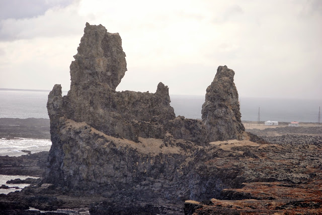 风雪看来一时半刻是停不下来了,我们离开海滩,来到了Londrangar(两块石头),公园里著名的景点之一,这里原来是火山环形口的一部分,在海水和狂风的侵蚀下,只剩下两块巨石。