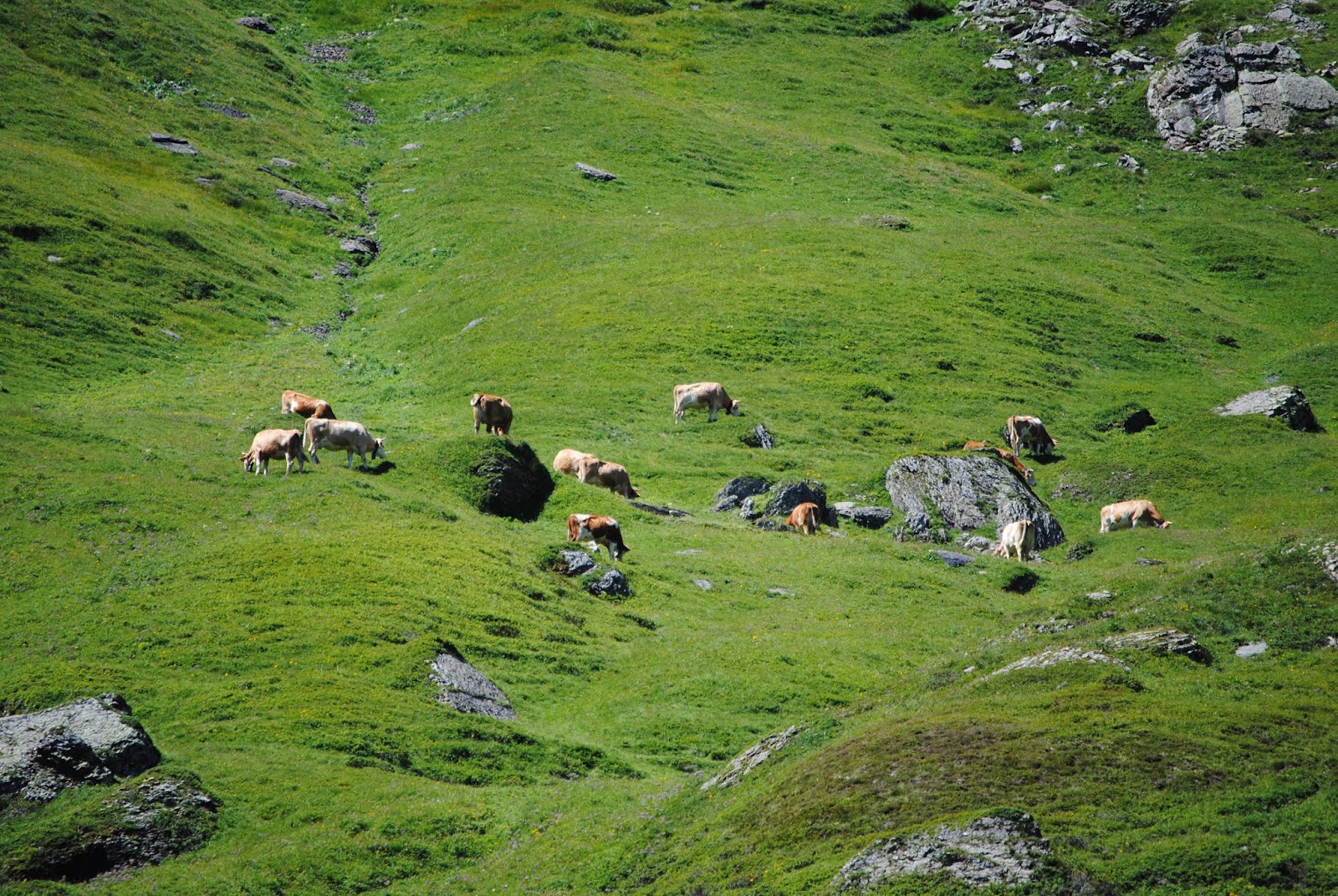 从山顶下来,回到缆车站,已经是正午,该出发走Panoramaweg Trail了,两点之前要赶到Kleine Scheidegg,上少女峰。一路走去,景色秀丽,精彩纷呈,真的是不虚此行。最先看到的是牛群,脖子上都挂着铃铛,在天地山水之间,自由自在,这个才是真正的散养有机牛吧。我们行走的山道上还有铁制的栏杆,只有人能开启通过,大概是为了防止牛群走失所设。