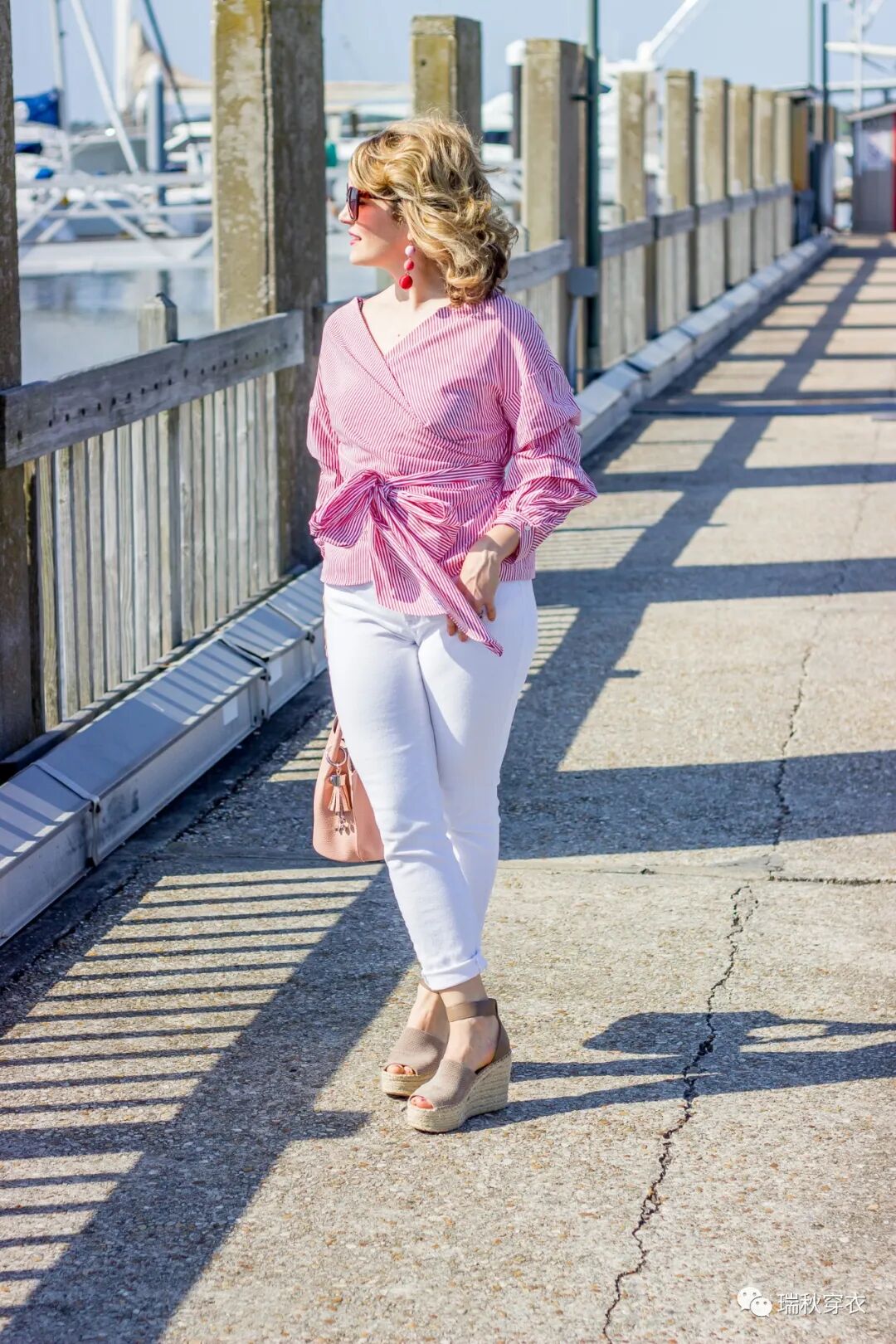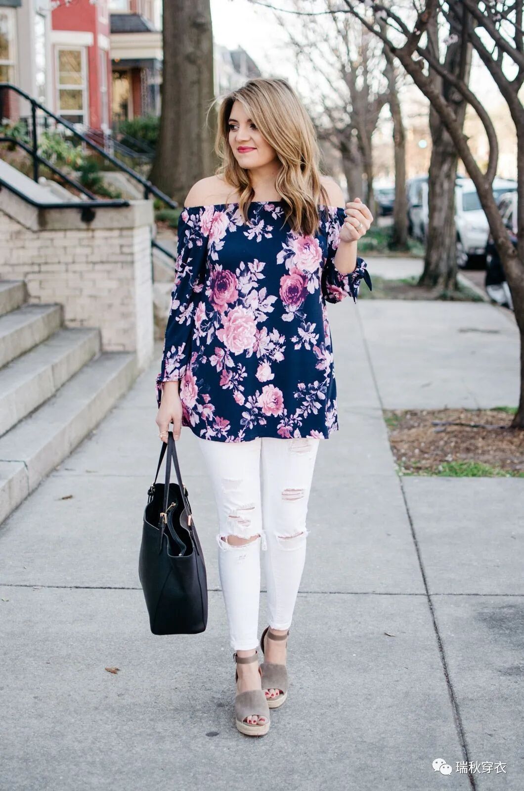 我前面说露肩装适合绝大多数女人,但是也有例外。如果你有比较明显的溜肩,那可能就不太适合穿露肩上衣。但是今天推荐的另外一种配白色紧身牛仔裤的上衣就很适合溜肩星人- 裹身上衣。和以前说过的裹身裙一样,裹身上衣能视觉拉长脖子线条,定义腰线,是微胖星人的不二选择。除此之外,裹身上衣形成的大V领口是视觉上弱化溜肩的最佳形状。分享几个好模仿的搭配例子。