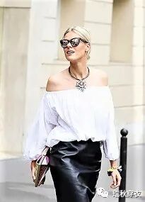我最喜欢的选择是搭配露肩上衣。露肩上衣首先会把人的眼光吸引到你露出的肩膀上。如果你没试过露肩装,相信我,你一定能穿得好看。绝大多数女人(例外的后面讲另选方案)的肩膀都是最容易露得漂亮的部位之一。其次,露肩上衣会在肩膀下方形成“一“字形的平直线条,视觉上让人觉得肩膀是全身最宽的部位,平衡了微胖星人大多担心的胯宽和大腿。下面这几张搭配都可以借鉴。今天专门找的微胖体型美女的街拍。