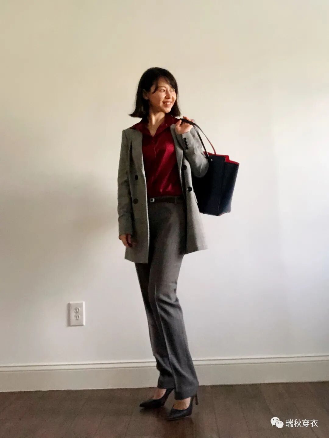 最后是最传统的正装衬衣 +西裤。我挑了一条主色调类似的西裤。衬衣颜色和前面长裙颜色和接近,也是酒红色。本来第一次拍的时候连皮带都没系,自己看了看实在看不过去,系上又重拍的,就这一条不起眼的黑皮带,观感差别很大。时尚真的在于细节,美女们千万别将就。我这些照片是bare minimum,我也鼓励自已以后要多用心些。