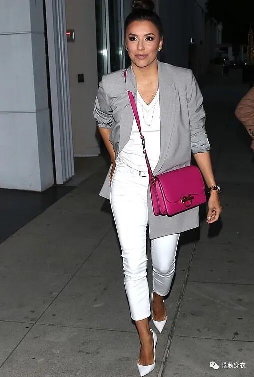 45岁的Eva虽然不如演Gaby时年轻苗条,但同样美丽动人,是45岁的风情,不是45强装25的美丽。她长穿的搭配之一 - 长款西装 + 短裤 + 无带高跟,既遮盖了下半身最宽的部位,又最大限度增加腿长感。腿型好看的小个头美女都很适合这招。