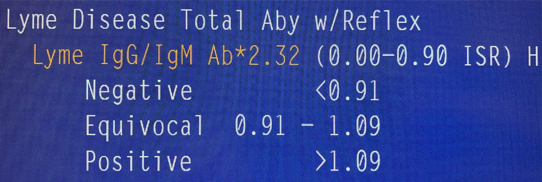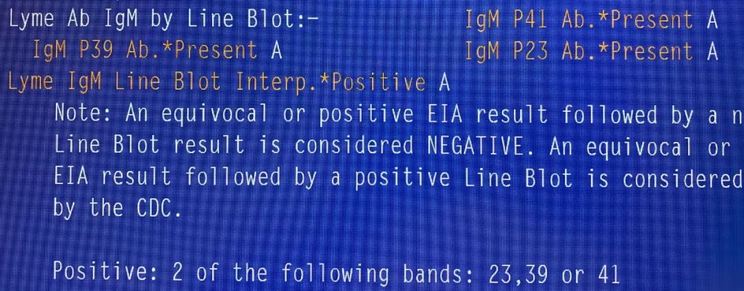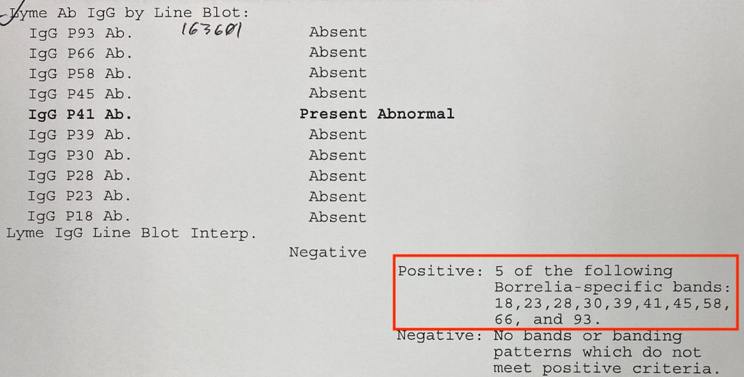 一般会检测3种IgM,需要其中2种或者2种以上阳性,才能确诊为莱姆病。这个病人3种IgM全都阳性。终于,给这个病人的诊断敲了实锤---莱姆病!