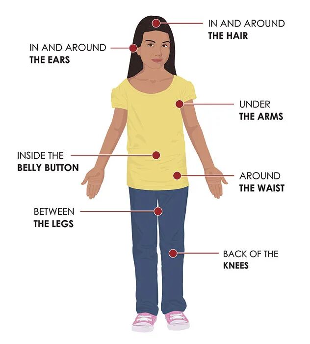 回家之后,一定要全身检查。Tick非常的狡猾,经常会吸附在一些难以看到或者触及的地方,比如头皮,耳后,肚脐眼里,皮带后面,两腿之间,还有腘窝(膝盖的后方)。可以请家里人帮忙一起检查。如果就一个人,可以用利用一下镜子。