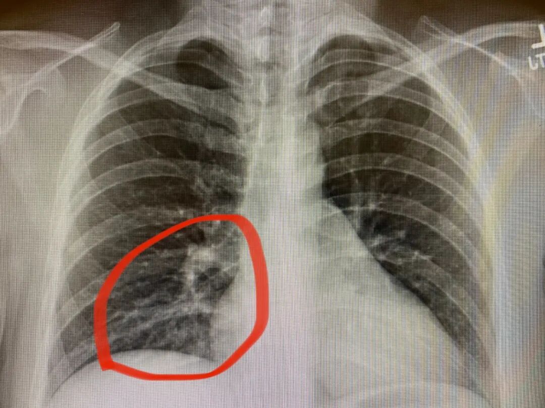 胸片显示右下肺炎有轻度的浸润病灶
