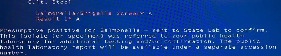 为了弄清楚腹泻的可能原因,医生建议患者留取一些大便,进行大便样本的化验(包括隐血试验:看看是不是有肉眼不见的血便;粪便白细胞检查:看看是不是有炎症情况;粪便寄生虫检测:看看是不是有肠道寄生虫感染的可能;以及粪便的培养:看看是不是有特殊的细菌感染)。患者第二天送来了大便样本,真相也很快浮出了水面:沙门氏菌阳性!