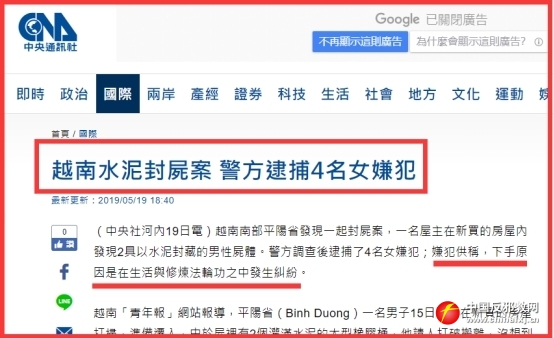 综合越南《青年报》、越南网、马来西亚《中国报》、台湾“中央社”等媒体报道,5月18日越南警方破获一起杀人案,2名男性“法轮功”人员被“同修”当做“恶魔”杀死并封在水泥桶中。警方逮捕了4名女性犯罪嫌疑人。由于嫌犯下手与弃尸手法残忍,水泥封尸案受到民众高度关注。
