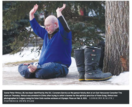 瑞陶尔2011年2月在卡加利奧林匹克广场习练法轮功的照片(Postmedia网站)。