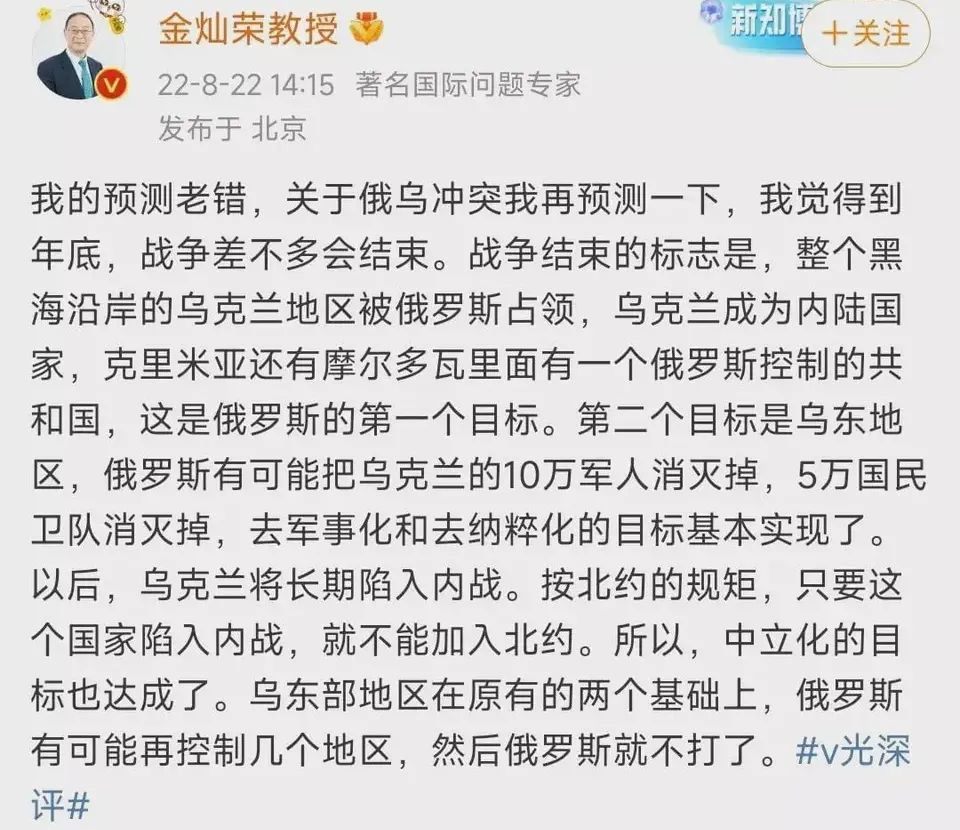 我们看看金教授的神预测:2月24日之前,金教授预测俄罗斯不会打乌克兰;俄军打响后,金教授预测24小时俄军拿下基辅;2月26日,金教授替泽连斯基敲响丧钟:泽连斯基的政治生命恐怕进入倒计时了;3月15日,金教授预祝普京胜利:“我估计到月底,普京会达到他的目标——彻底占领乌东地区,包括基辅;可能会搞一个亲俄政府,签个协议,俄军就撤了。”