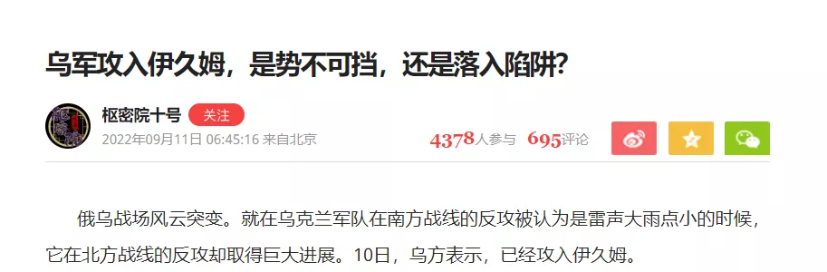 俄粉自媒体也被乌军的闪电战打得心绞痛,只好玩弄语言游戏来自救,写出情趣盎然的标题——“俄军胜利撤退,乌军仓皇追击”,环球时报官微更是赤膊上阵,替俄军布下埋伏圈《乌军攻入伊久姆,是势不可挡,还是落入陷阱》。也有俄粉认为俄军是在用“空城计”,但乌军不解风情不按套路出牌,一阵猛冲乱打,真的攻城略地了,这就破坏了“空城计”的韵味。本来,空城计只在诸葛亮和司马懿这种旗鼓相当的对手之间才能玩出意境,没有知音就是媚眼做给瞎子看。
