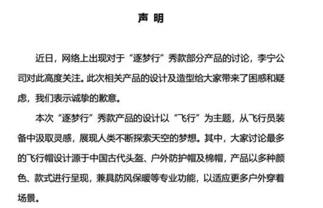眼看李宁梦碎“逐梦行”,不禁让人唏嘘不已:一惯吃爱国饭的李宁,也有被爱国消费者噎死了的时候呀。以前老赚爱国附加值,这次该缴点爱国增值税了吧。李宁集团不服气,难道养了一辈子鹰,还会被雕啄瞎了眼?立马发出声明,从专业角度教导消费者,说这款帽子是源于中国古代头盔云云。