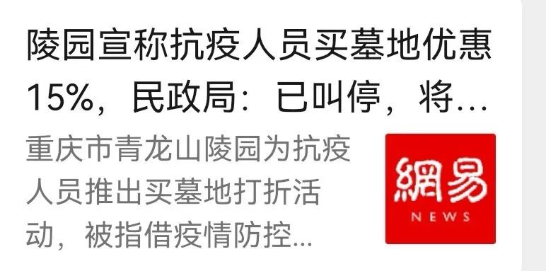 都知道抗疫人员很辛苦,流汗流泪受委屈,各行业给予一些优惠和照顾也是应该的,比如卖菜的卖肉卖蛋的卖水果的打折优惠一下,对抗疫人员提高士气肯定有帮助。如果房产商也能对抗疫人员打折优惠,更有助于提升抗疫人员的社会评价。但青龙山陵园是卖阴宅的,也对抗疫人员打折优惠以表敬意,就有点瘆人了。