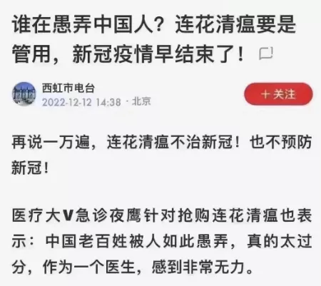 港真,疫情三年里官民都憋了一肚子火,迫切需要一个出气口。核酸、方舱、封门诚然让人窝火,但牵扯面太广,不宜立即卸磨杀驴。而连花清瘟防疫功效为零,却搭疫情便车赚得盆满钵满,拿连花清瘟利益集团开刀最合适不过了。不论是按古老的巫术失灵处罚规则还是按现在司法条例,连花清瘟“药物”们都该受到应有严惩。