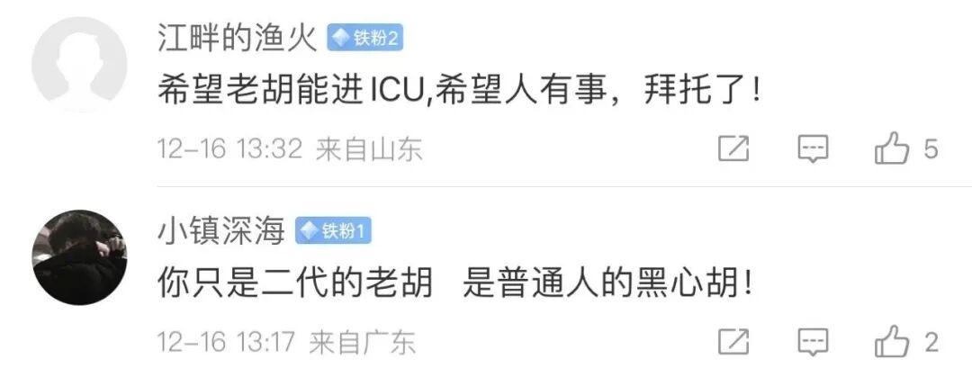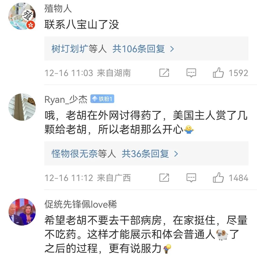 老胡把自己看得很重,好像一言一身关乎天下视听。北京那么多阳了的,只是在家吃药静养,都当是自己的事儿。老胡阳了却牵扯民情民意,到了“不阳不平民愤”的高度。能力越大责任越重,地位与民愤成正比,这就做实了老胡在“躺平派”里的标杆地位。高人能化腐朽为神奇,老胡能化腐朽为神叨叨,总能畅游在“时代的洪流”里。