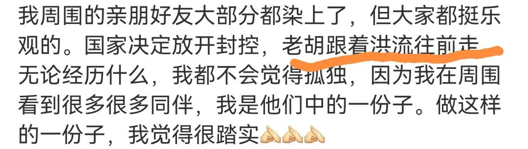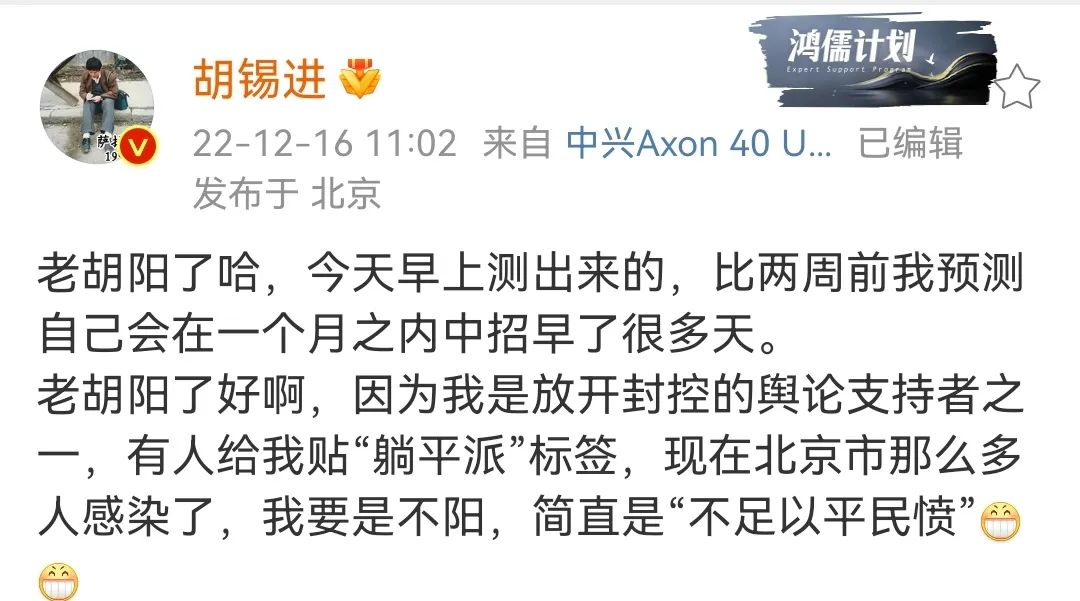 老胡阳了好啊,因为我是放开封控的舆论支持者之一,有人给我贴“躺平派”标签,现在北京市那么多人感染了,我要是不阳,简直是“不足以平民愤”。