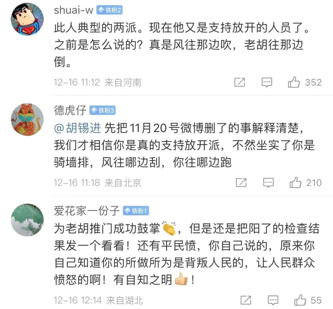 老胡一直行走在时代的洪流里。一个月前封控是主流,老胡坚决支持封控;二十条传达后,有序放开成主流,老胡又自封是“推动放开”派,摇身一抖又挤进“时代的洪流”里了。所谓“贼不走空”,老胡没有踏不上的点,步步惊心,步步莲花,回旋自如。老胡为了巩固在“放开派”里的地位,十多天前就对病毒笑脸相迎,准备以身许阳。一般人都要阳一次,老胡却能把感染阳性做成跳进“时代洪流”里的投名状。术业有专攻,媚术就在日常里,一颦一笑尽妩媚。
