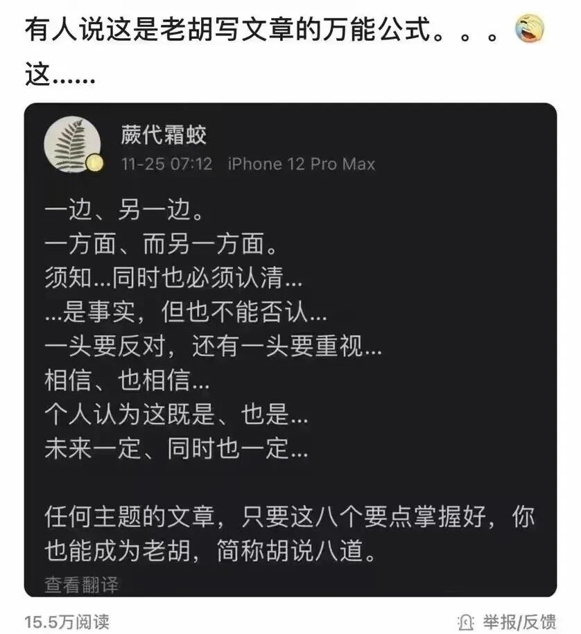 所以老胡说自己是解除大规模封控的推动者又有什么毛病?这是老胡的文章格式必然的结果:一方面老胡支持全面封控,而另一方面老胡又推动了封控的解除……文章格式摆那里,不以老胡的意志和事实为转移,老胡也没办法呀!绝顶剑客,不是剑客在舞剑,而是剑在舞剑客。不是老胡在运笔,而是笔在运老胡,如庄生晓梦迷蝴蝶,不知谁是幺蛾子。