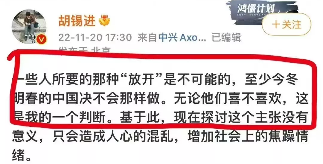 老胡自诩为解封的推动者并不是坏事,只要对恢复正常生活有利,不妨让他摘桃子。套用老胡作文模板:老胡支持封控是事实,但也不能否认他现在呼吁解封的积极性。一头要警惕老胡的投机,还有一头要重视他投机显示的背景局势的变化……