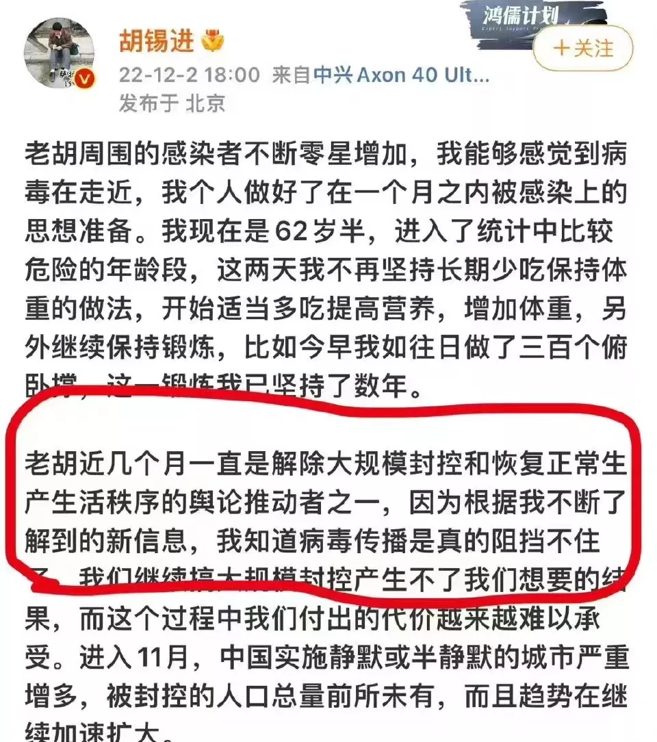 疫情政策进一步完善和转换的迹象越来越清楚时,老胡跳出来摘桃子了:“老胡近几个月一直是解除大规模封控和恢复正常生产生活秩序的舆论推动者之一。”仔细查看老胡近几个月的言论,一直在谆谆教诲群众服从隔离顾全大局,即使隔离转运车翻了,封闭小区着火了,也不能“迁怒”防疫政策云云,咋一转身成了“解除大规模封控”的推动者了呢?汪精卫麾下的伪军可以在黎明前起义投诚,国家也会给予出路,但周佛海、丁默邨之流再自嗨也不敢说自己是抗日的“推动”者,更不敢自诩是“中流砥柱”。老胡给自己整容时真敢下毒手呀!是个狠人。坊间流传着四条汉子的诨名——