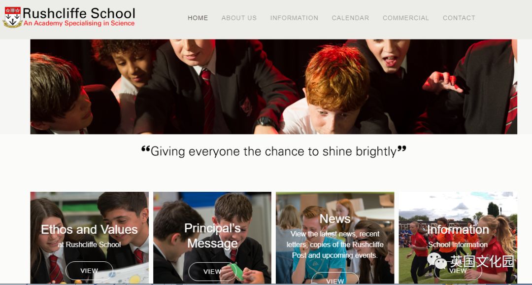 这所中学不是为精英而设的学校。我的一位中学教师朋友曾建议我送可鑫上私立学校:“这孩子聪明,上私立学校有更大的发展前途!”我笑而不语,心想:私立学校是培养精英的地方。要当精英往往需要舍弃一颗平常心。我更希望可鑫在常态中成长,能遇见和了解不同类型和层次的孩子,而非仅与单一的精英群体打交道。Rushcliffe School是一所高度兼容的学校,提倡的口号为:给每一名学生施展才华的机会(Give Everyone the Chance to Shine Brightly)。下图为学校网站截图,这句口号醒目地摆在网页上。校内礼堂张贴了此口号,校长也不断重复。很快,我就发现这并非仅是一句口号,这一教育理念的确在此校的教学中得以施行。