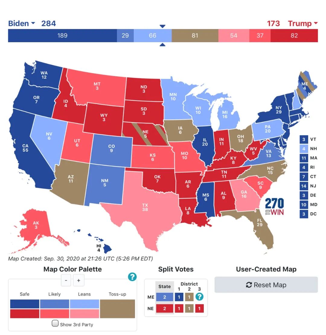 美国大选全美538票,成功竞选总统必须拿到270票。按人口面积,大州票多,小州票少。拜登有加州纽约这些大州,即使输了宾州和德州,票也可能够了。但是中间摇摆州(浅粉浅蓝金色)还是有180多票, 最后竞选结果谁也不知道。2000年小布什和2016希拉里其实是赢了全美投票人绝对多数票,但是输在按州记票数上。这个电子时代,如果人人网上投票,按票数多少决定胜负不是最公平吗?记得2016年,希拉里和川普票数很接近。川普胜出后连夜股市大跌,因为市场不喜欢惊异。但是第二天马上回过味来是共和党当政,对经济股市是好消息,一路狂涨,然后一去不回头。昨天辩论之后,今天股市也是小涨,因为拜登民调保持上升没有什么大错,但是等市场回过味来,未来如果民主党执政高税收大政府,这个方向很可能会调整。