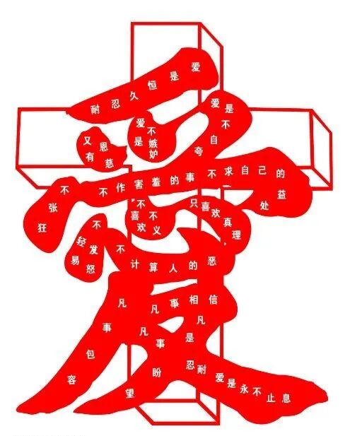 第一次去教堂,上帝就给了我们惊喜:教堂讲台左侧挂着一个大大的爱心形状的牌子,上边写着一个大大的“爱”字,“爱”字的笔画上写满了《圣经·哥林多前书》13章第4-8节的关于“爱的诗歌”的经文。第一句话“爱是恒久忍耐”立时抓住了我妻子的心,也让她反省自己从前以“爱”的名义伤害我们的女儿和其他人的急躁言行。