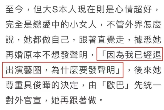 如今的大S似乎又一次陷入了一场美好的爱情,甚至在公开的回应中说,自己已经退出了演艺圈。