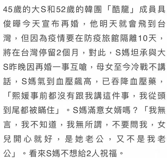 可没想到淡出公众视线没多久,大S默默给所有人来了一个超级大惊喜,这个“所有人”据说还包括了她的妈妈和小S,台媒爆料这件事“气得妈妈直吞降压药”。