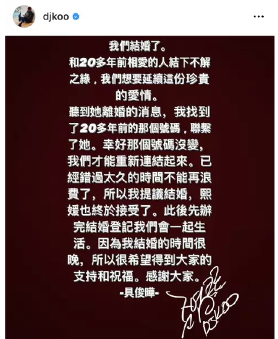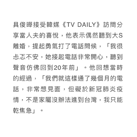 这咱就不得不佩服具俊晔了。他在大S离婚后,找到了20多年前留着的大S的联系方式,立刻拨通了问候电话。这一打就打了好几个月,打到旧情复燃。