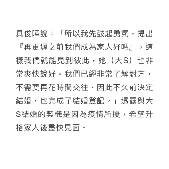 大S先斩后奏,在登记后才对所有人宣布了和韩国90年代流行男团酷龙成员具俊晔已经结婚的消息。