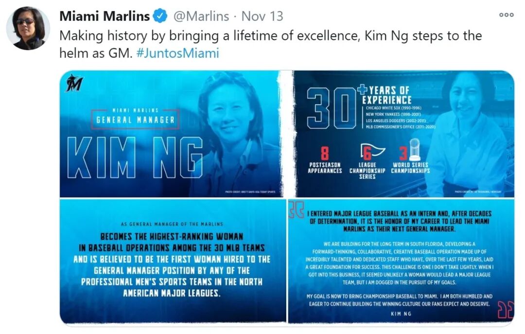 Wikepedia: Kimberly J. Ng (born November 17, 1968) is an American executive in Major League Baseball. She is currently the general manager of the Miami Marlins and the highest-ranking female baseball executive. She is the first woman to serve as general manager of a team in the Big Four leagues in North America and the first person of East Asian descent to serve as general manager of an MLB team. Ng was born in Indianapolis, Indiana, the first of five daughters, to Jin Ng and Virginia Fong. Her father, an American of Chinese descent, was a financial analyst, and her mother, Thailand-born of Chinese descent, was a banker.