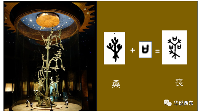 而“丧”的甲骨文,则是在桑树上放上一些器皿状的东西。