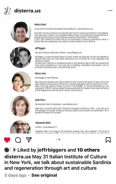 去年,我受纽约意大利文化中心邀请,向意大利观众分享自己在撒丁岛的学习与艺术节体验。那天,我既从“旅行者”的角度讲述撒丁岛美食的惊喜,也从“观察者”的视角描摹当地的传统、工艺与味道。那场讲座让我产生一种微妙的醒悟——我原本只是一个热爱意大利文化的中国人,而在他们眼中,我已成为一位颇具影响力的“美食旅行者”(Food Blogger and Travel Influencer)。