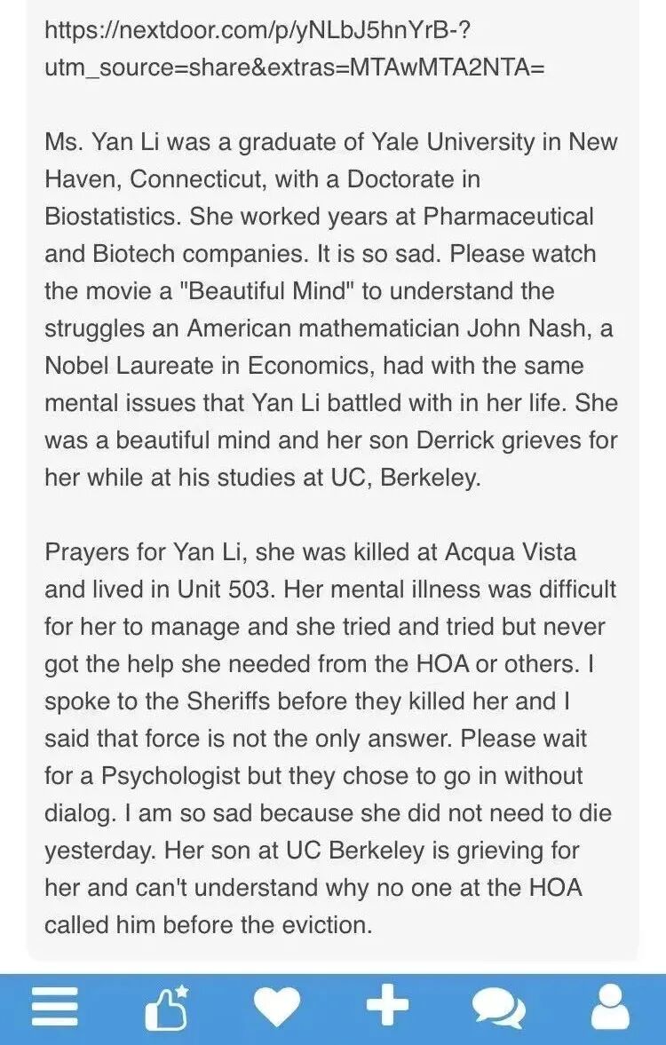 一个据称是她同小区财务(treasurer)的人,在网上(Nextdoor app)发帖说,死者Yan生前曾经耶鲁博士毕业,也在药厂工作过,孩子现在在伯克利读大学;该人描绘她有类似电影《美丽心灵》中诺奖得主约翰·纳什类似的精神疾病。
