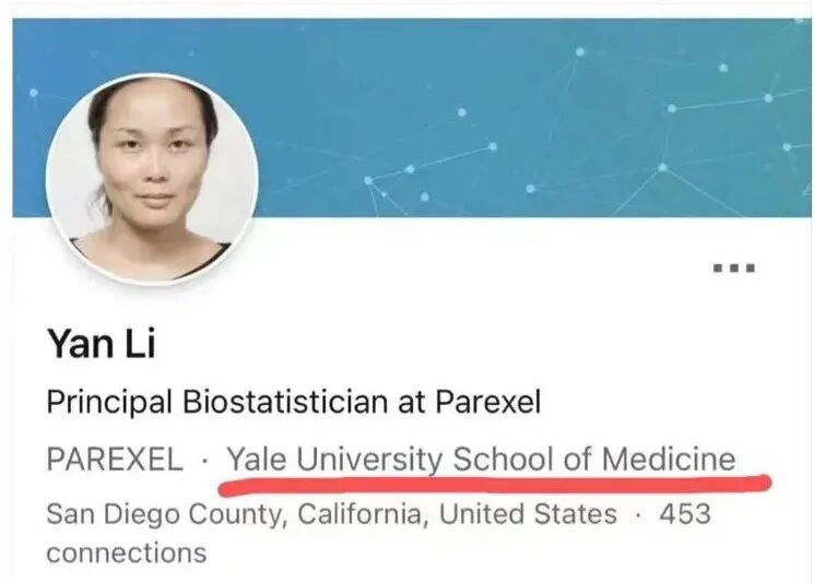 下面是网上传的据说是Yan Li领英资料的截图。也验证了“耶鲁博士”、“药厂工作过”这些关键词。