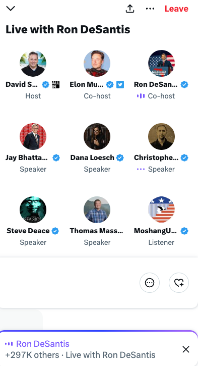 德桑蒂斯选择通过与推特老板马斯克对话的方式,公布自己的参选消息。今天推特space被挤爆了,同时有近60万人在线,弄得德桑蒂斯的宣布耽误了半小时,左派媒体都在讽刺庆祝。下面这是他宣布参选的讲话。