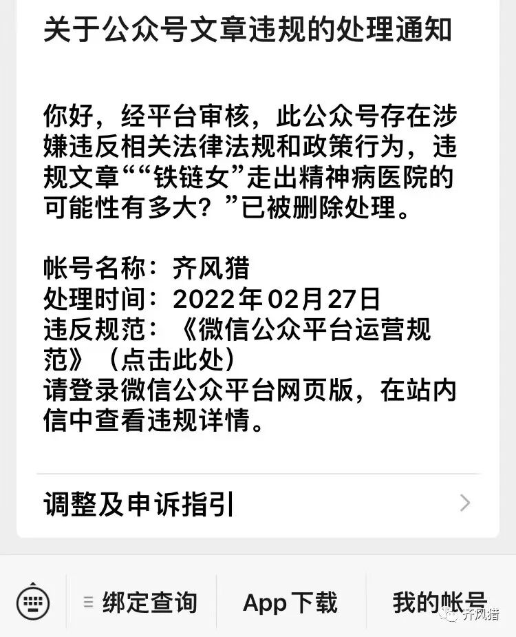 在这个过程中,我先后有三篇原创评论被封(仅仅是评论文章),这使我感到非常失望。不过,我还是要感谢微信公众平台,允许我在徐州“铁链女”事件中说了一些话,说出了一些想说的话,以致使我没有感受到完全意义上的压抑。