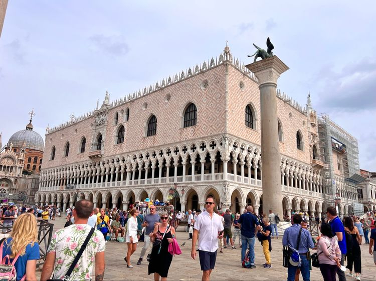 圣马可大教堂 (Basilica di San Marco),威尼斯的标志性建筑,建造历史可以追溯到九世纪,曾经是中世纪欧洲最大的教堂,这里收藏有威尼斯守护神圣马可的遗骸,也收藏了大量十字军东征时搜罗来的宝物,还有大量的壁画和雕塑。参观教堂排队的人实在太多了,大太阳底下晒一两个小时实在令人生畏,放弃了进教堂的愿望。