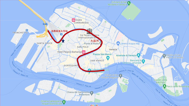 在穆拉诺岛乘坐3号水上巴士20多分钟到达威尼斯 Ferrovia A/B 站,下船就是威尼斯主岛圣路西亚火车站 (Venezia Santa Lucia),我们预订好的 AirBnB 民宿就在大运河边上,正对着火车站,跨过赤足桥就到,非常方便。